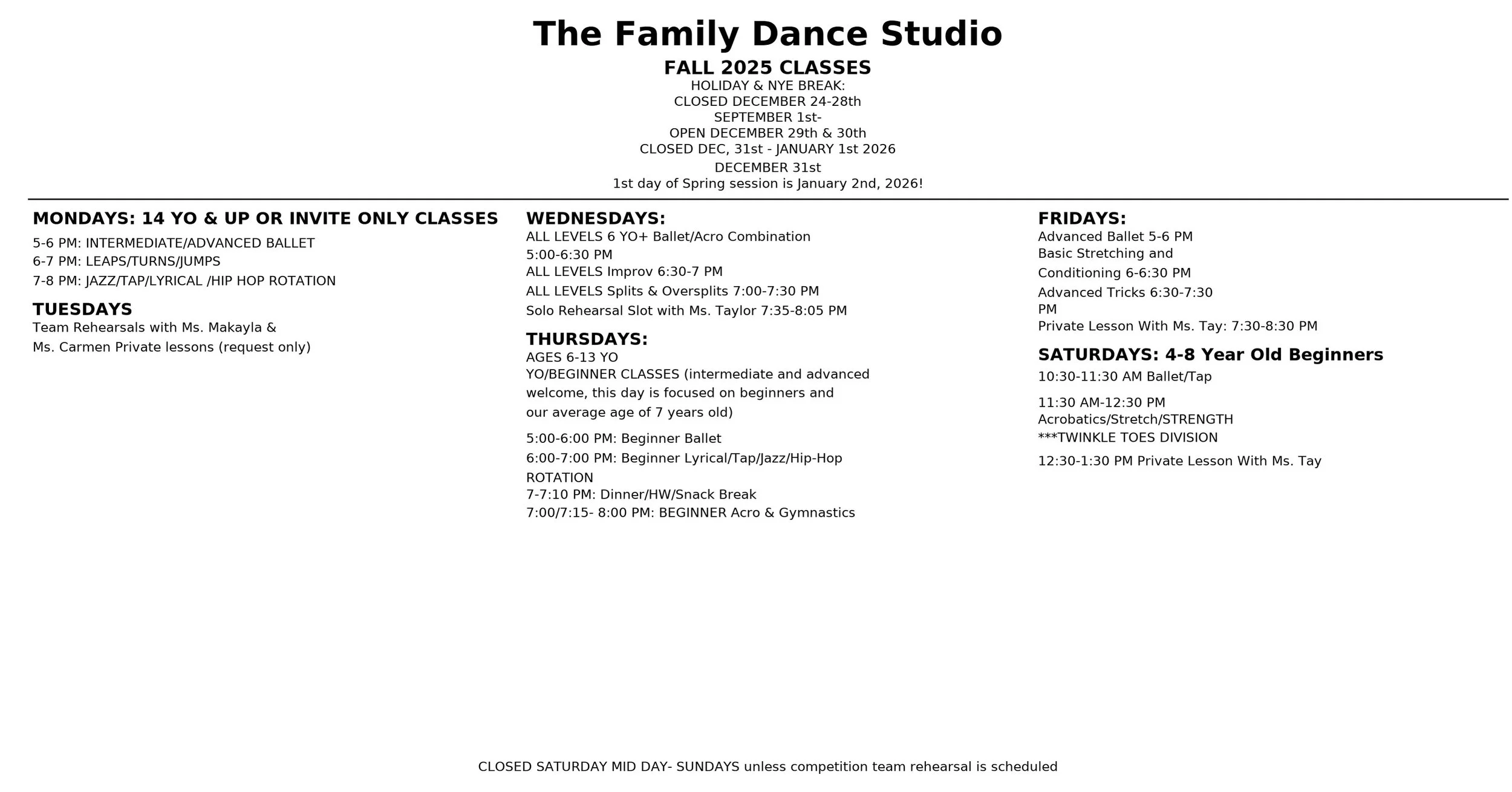 Our regularly scheduled Monday - Saturday classes give every age and level of student the opportunity to have fun learning dance while being taught proper technique and all around dance skills. Dance classes teach ages 1-100 more than just dance, they boost confidence, built strength, learning the use of proper stretching, how to wait for your turn, how to have fun doing what you enjoy while learning to navigate our spacial awareness, communication skills & respect for self and others.
